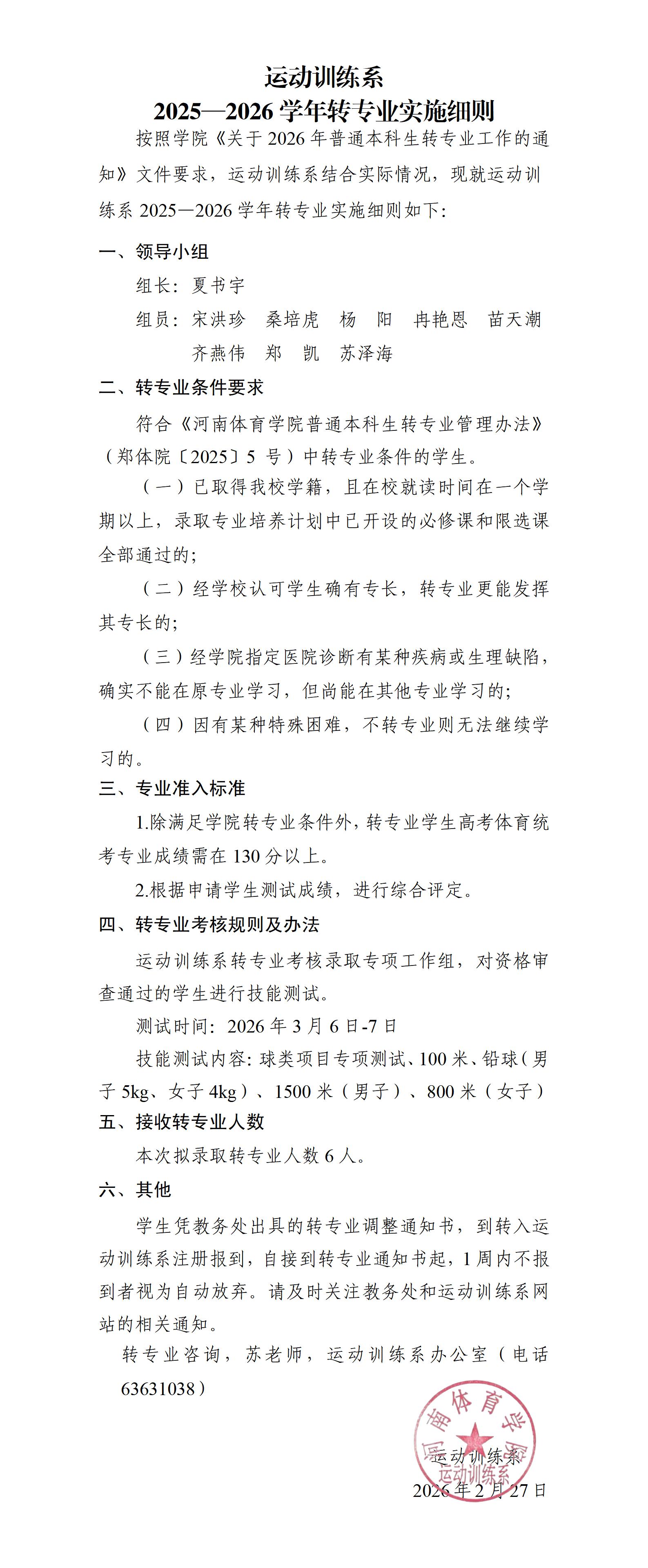 运动训练系2025—2026学年转专业实施细则